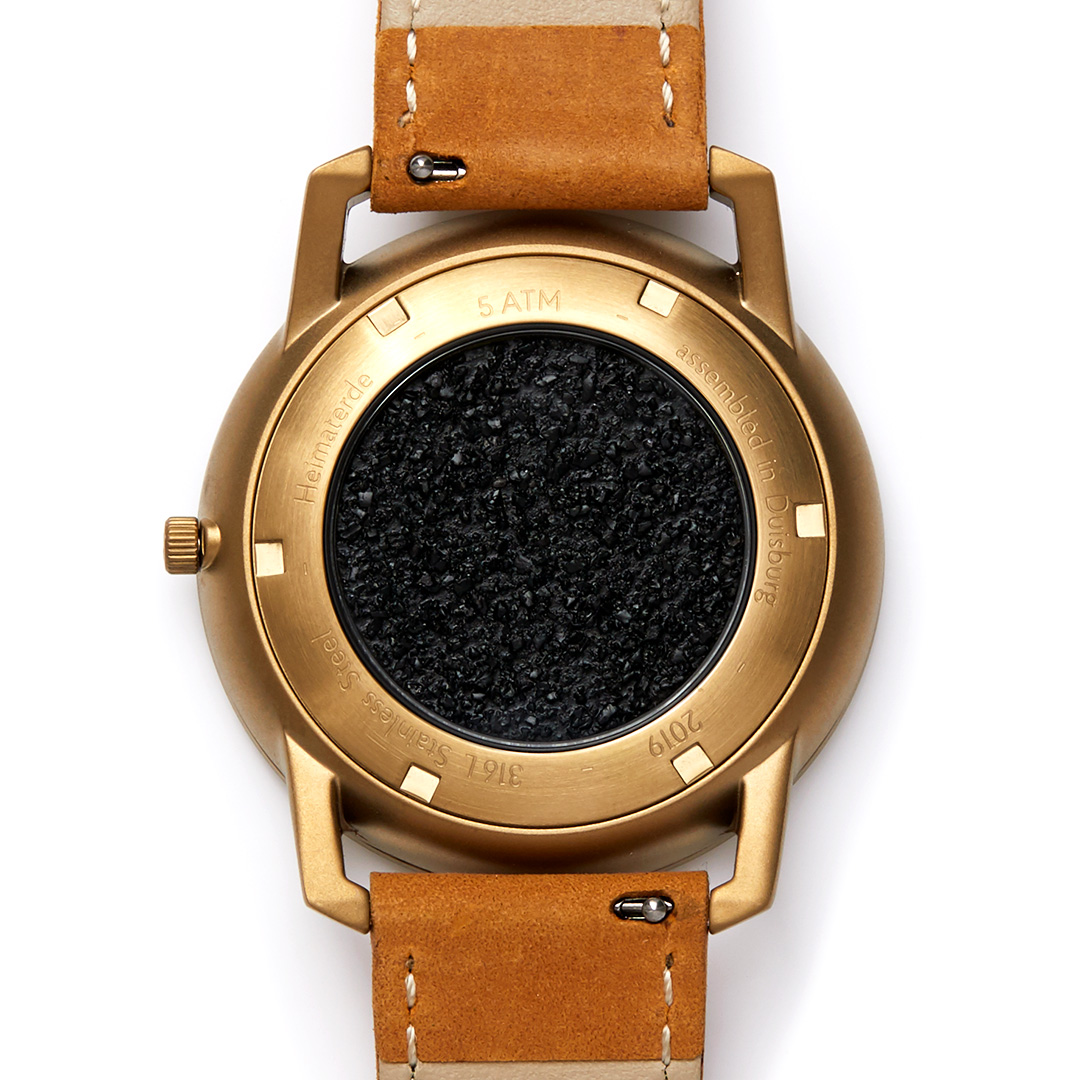 Ein besonderes Highlight der Kollektion ist das Gehäuse, das durch die Integration originaler Steinkohle der traditionsreichen Zeche Prosper-Haniel veredelt wird. Das tiefschwarze Material, das als Symbol für die jahrhundertelange deutsche Bergbaugeschichte dient, ist nicht nur ein visuelles Merkmal, sondern verbindet den Zeitmesser mit einem bedeutenden Teil der Heimatkultur. Die Steinkohle, die den Namen "Heimaterde" trägt, ist stilvoll hinter hochwertigem Mineralglas auf der Rückseite der Uhr eingebettet.