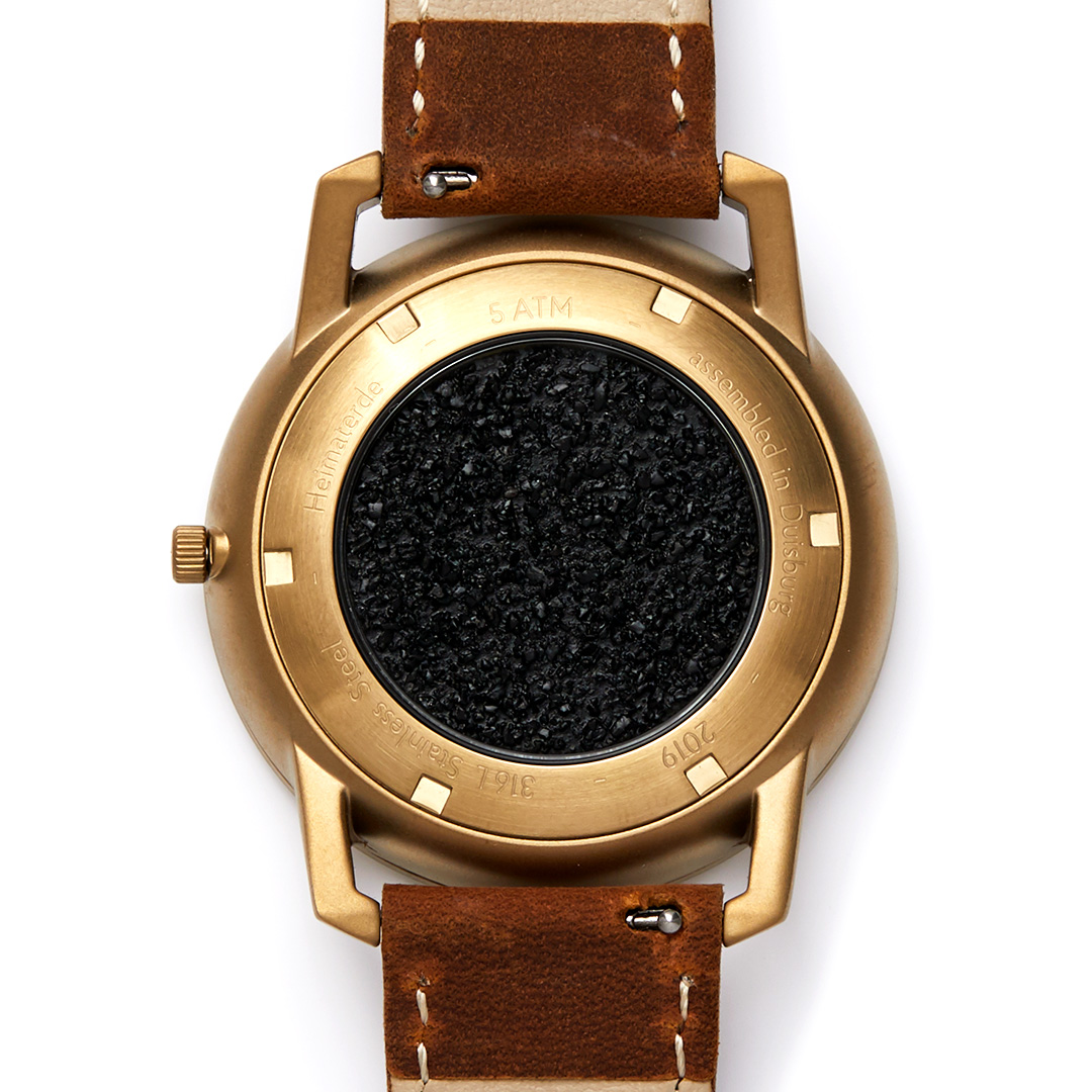 Ein besonderes Highlight der Kollektion ist das Gehäuse, das durch die Integration originaler Steinkohle der traditionsreichen Zeche Prosper-Haniel veredelt wird. Das tiefschwarze Material, das als Symbol für die jahrhundertelange deutsche Bergbaugeschichte dient, ist nicht nur ein visuelles Merkmal, sondern verbindet den Zeitmesser mit einem bedeutenden Teil der Heimatkultur. Die Steinkohle, die den Namen "Heimaterde" trägt, ist stilvoll hinter hochwertigem Mineralglas auf der Rückseite der Uhr eingebettet.