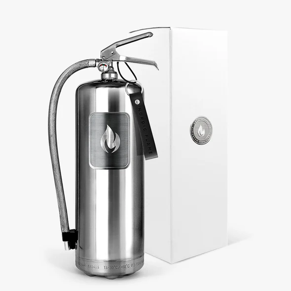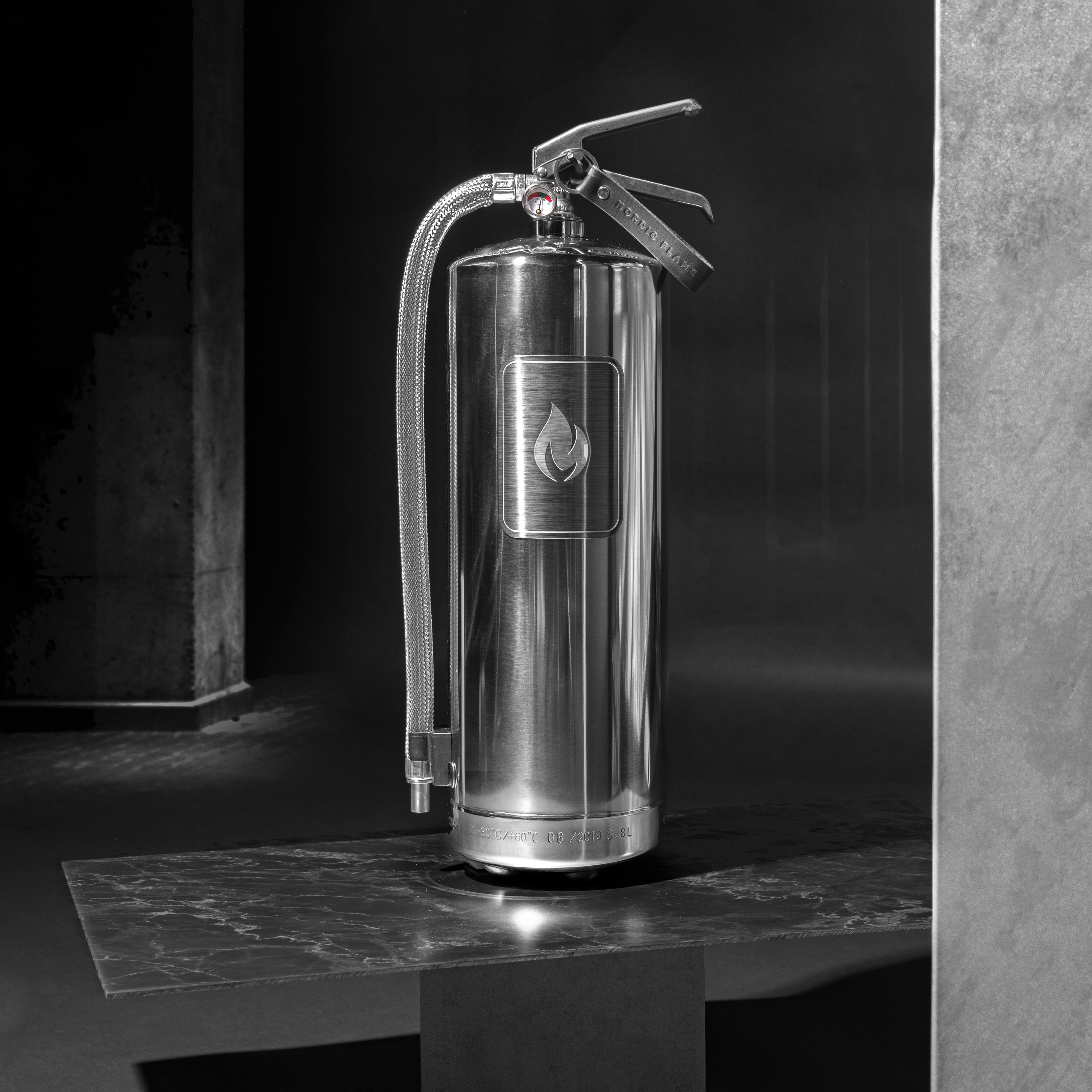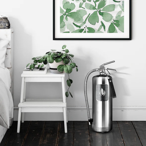 Dieser Feuerlöscher im eleganten metallischen Stil ist mit einem schwarzen Lederakzent am Band ausgestattet und wurde aus handpoliertem Edelstahl hergestellt. Er wurde nach den höchsten europäischen Sicherheits- und Qualitätsstandards (EN3) gefertigt und getestet – ein praktisches und zugleich elegantes Accessoire für Zuhause.
