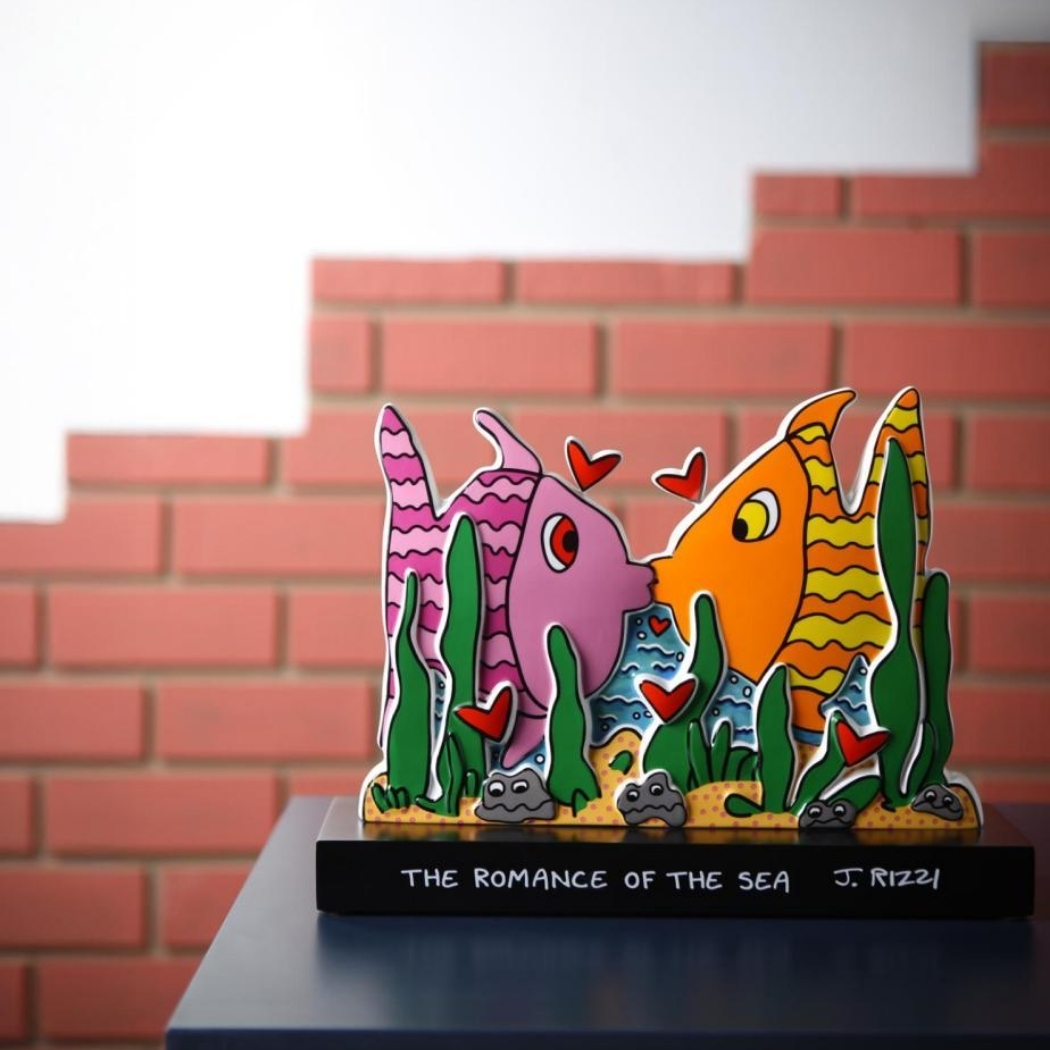 Tauchen Sie ein in die bunte und fröhliche Welt des New Yorker Pop-Art-Künstlers James Rizzi. Die Skulptur „The Romance of the Sea“ fängt die Magie des Ozeans auf Rizzi-typische Weise ein: mit leuchtenden Farben, verspielten Details und einer herzlichen Botschaft. Zwei verliebte Fische inmitten einer maritimen Szenerie machen dieses Werk zu einer Liebeserklärung an das Leben und das Meer.