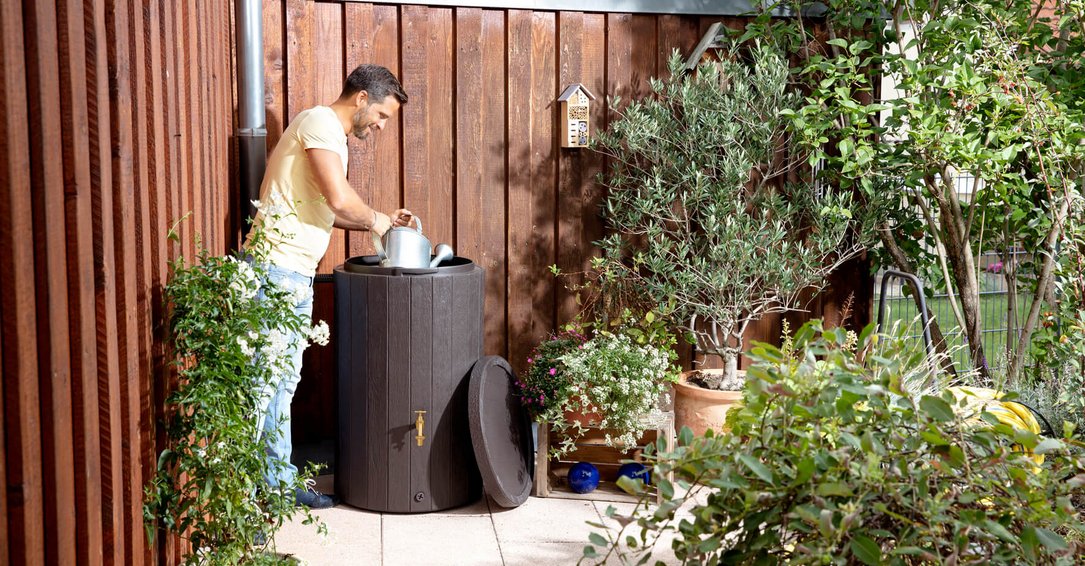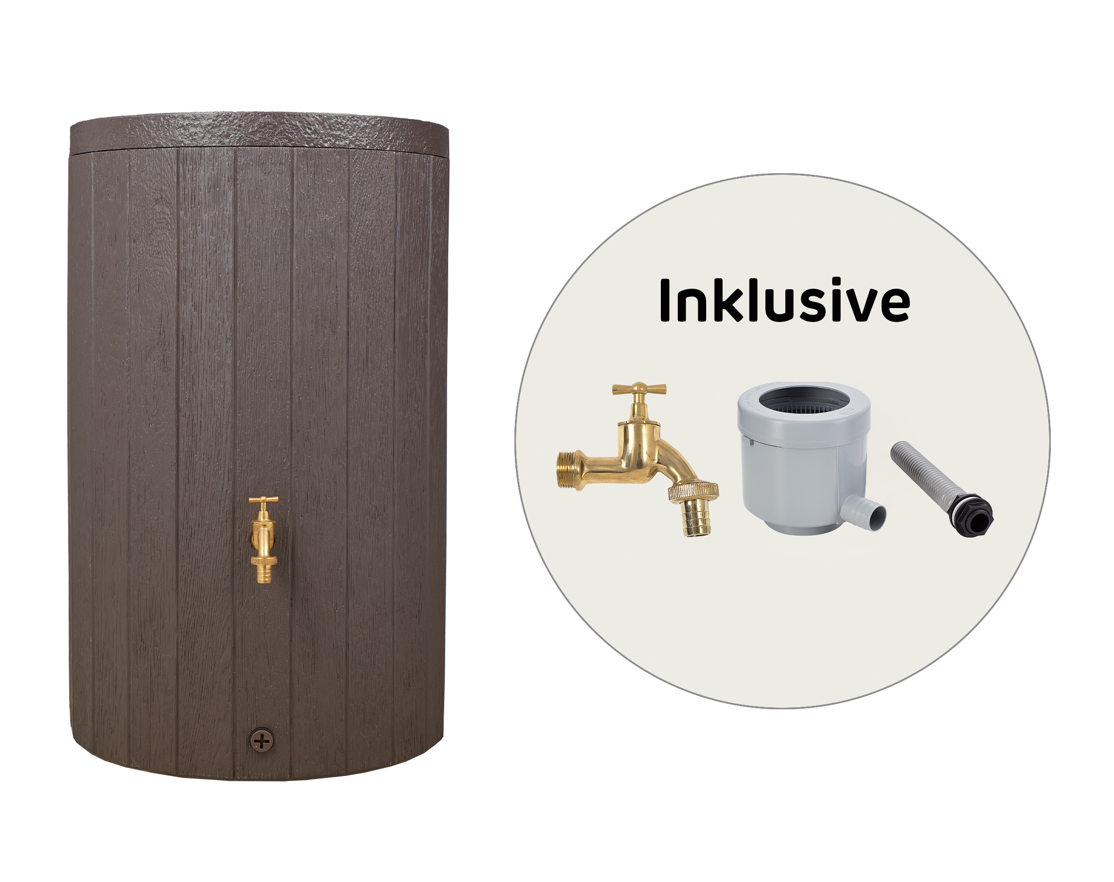 Der Regenspeicher überzeugt durch sein modernes Design in täuschend echt wirkender Holzstruktur und fügt sich harmonisch in jede Gartenumgebung ein. Hergestellt aus 100 % Recycling-Kunststoff, vereint er Nachhaltigkeit mit Langlebigkeit.
