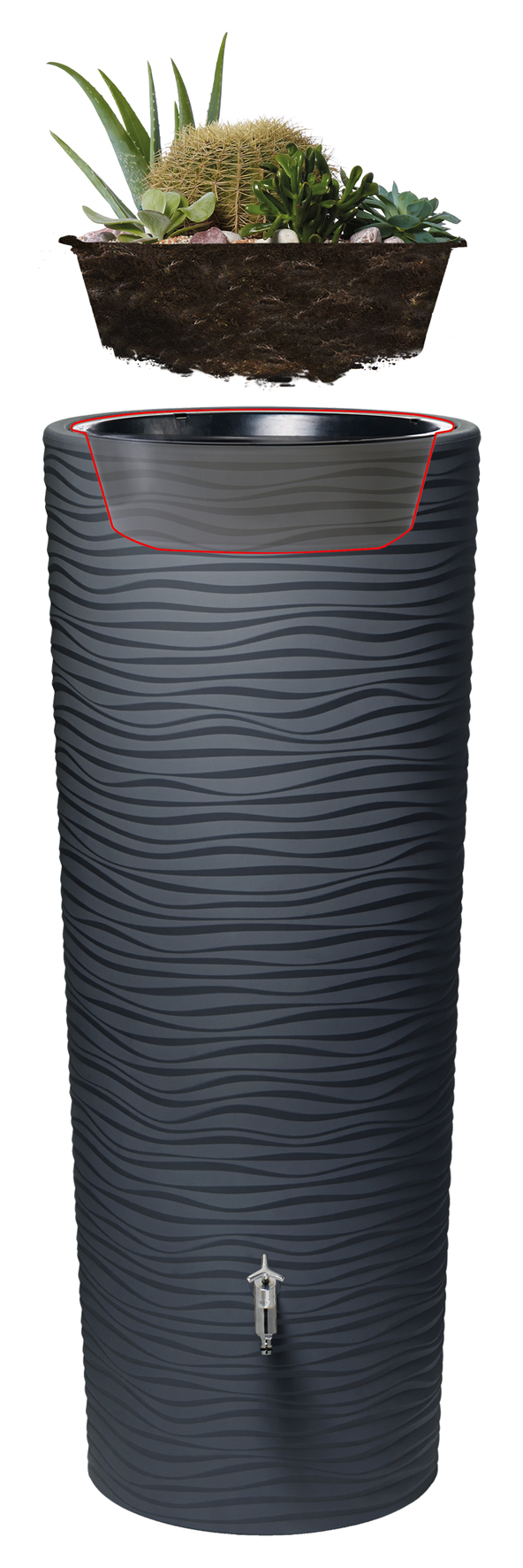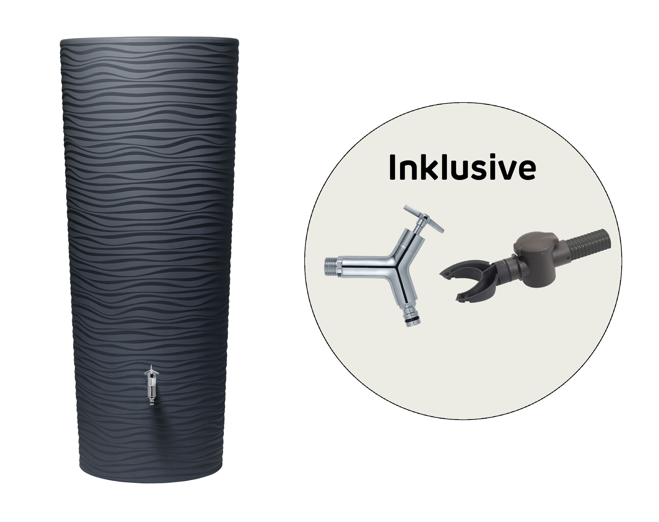 Dieser Regenspeicher besticht durch seine einzigartige, wellenförmige Oberflächenstruktur und vereint zwei Funktionen in einem: zuverlässige Regenwassernutzung und dekoratives Gestaltungselement im Garten.