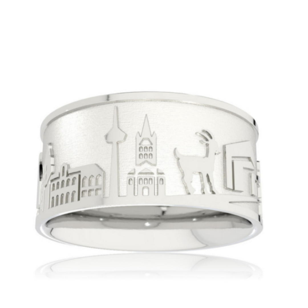 Detailreich zieren ausgewählte Wahrzeichen der Stadt Köln die Oberfläche des Rings. Der Kölner Dom mit seinen markanten Türmen, die Hohenzollernbrücke, eine charakteristische romanische Kirche der Altstadt sowie der Rhein formen die Silhouette. Abgerundet wird das Design durch den Schriftzug „KÖLN“.