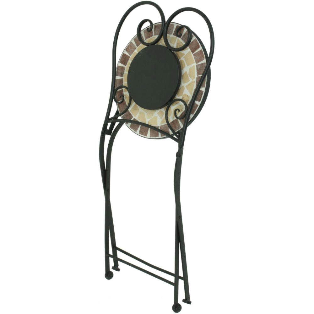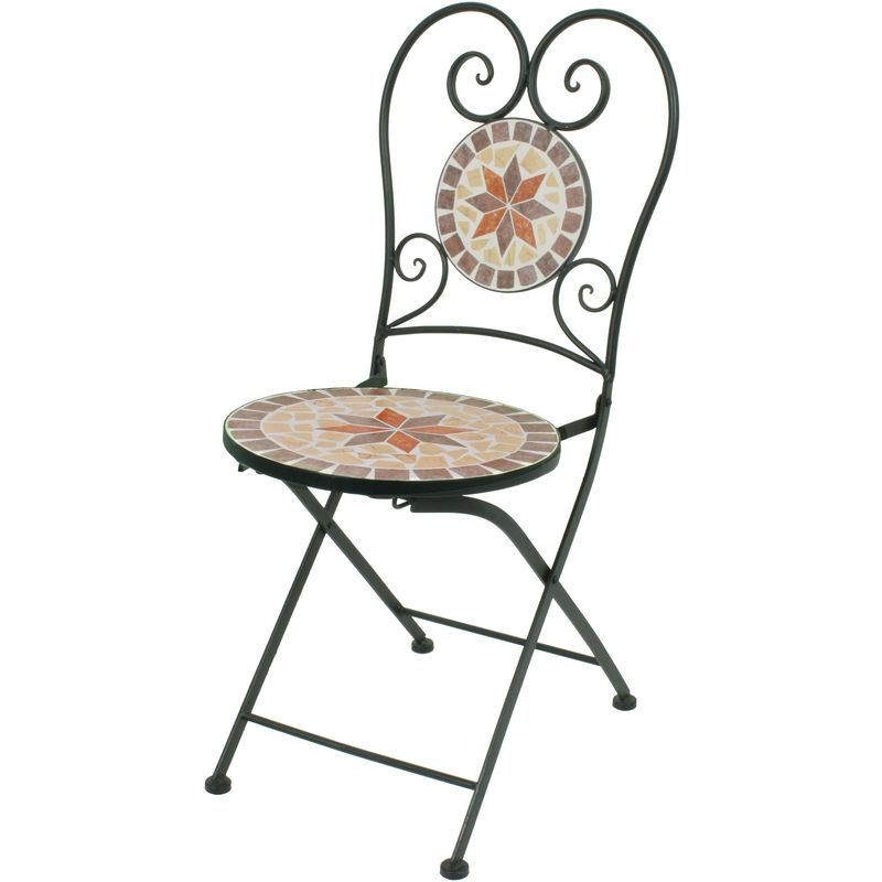 Das Balkon-Set AMARILLO verbindet klassisch-mediterranes Design mit robusten Materialien und hoher Alltagstauglichkeit. Tischplatte, Sitzflächen und Rückenlehnen sind mit kunstvollen Mosaiken aus keramischem Steingut gestaltet. Sternförmig eingearbeitete Scheiben in Sandtönen von Beige bis Ocker setzen warme Akzente und bilden einen harmonischen Kontrast zu den geschwungenen Bögen des schwarz lackierten Stahlgestells. Das Set eignet sich als funktionaler Blickfang für Balkon, Terrasse oder Garten und bietet zuverlässige Stabilität im täglichen Gebrauch. Die Stühle sind klappbar und dadurch schnell und platzsparend verstaut; der Tisch wird aufgrund des hohen Gewichts fest am Gestell montiert und steht besonders sicher. Kunststoffkappen an den Stahlfüßen schützen empfindliche Untergründe. Mit einer Belastbarkeit von 120 kg pro Stuhl und 40 kg für den Tisch überzeugt AMARILLO als dekorative und zugleich belastbare Sitzgelegenheit für zwei Personen.