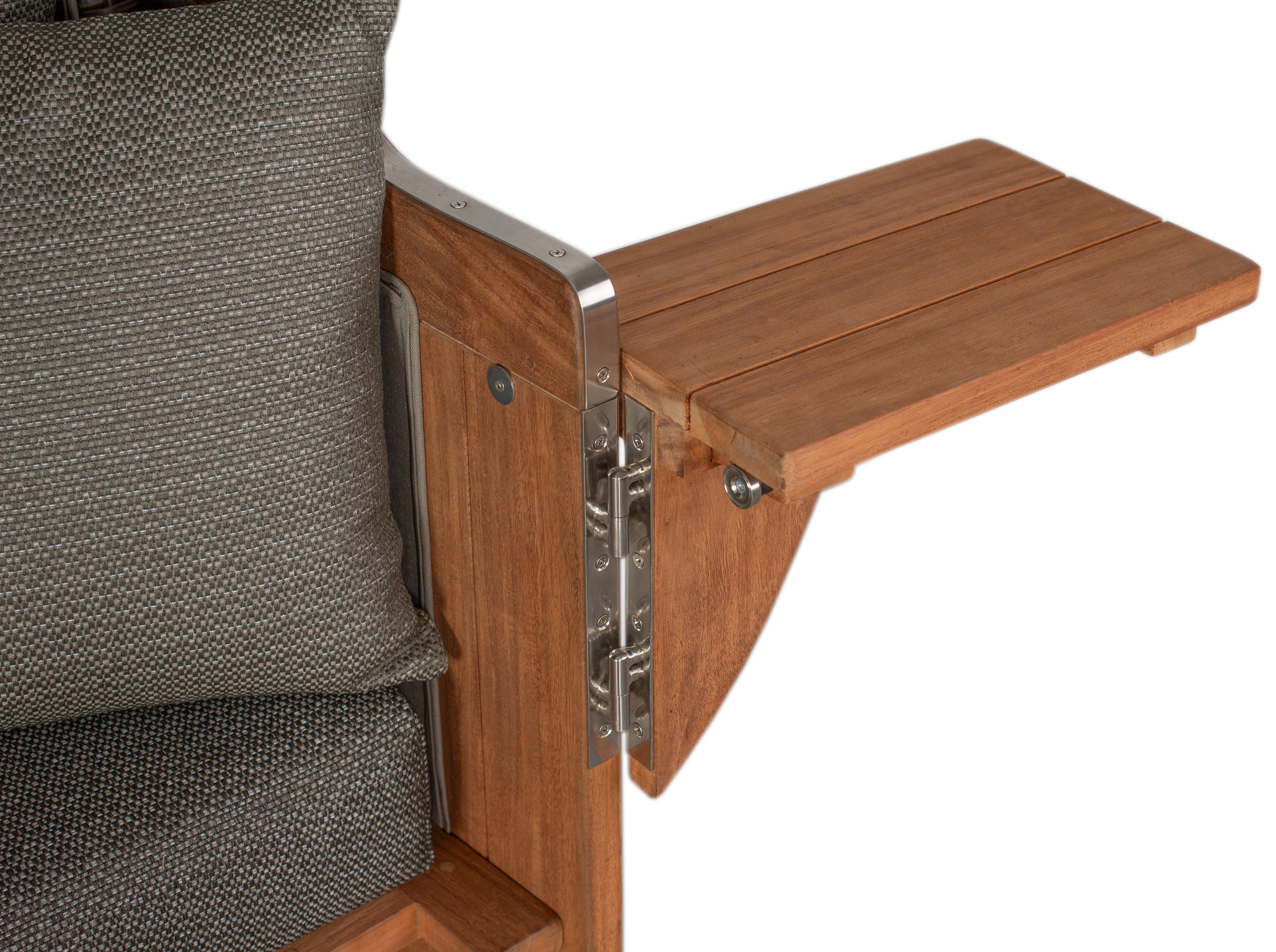Die hohe Rückenlehne ist mehrfach bis 165° verstellbar, ausziehbare Fußstützen und zwei schwenkbare Cocktailtische sorgen für entspannte Stunden zu zweit.