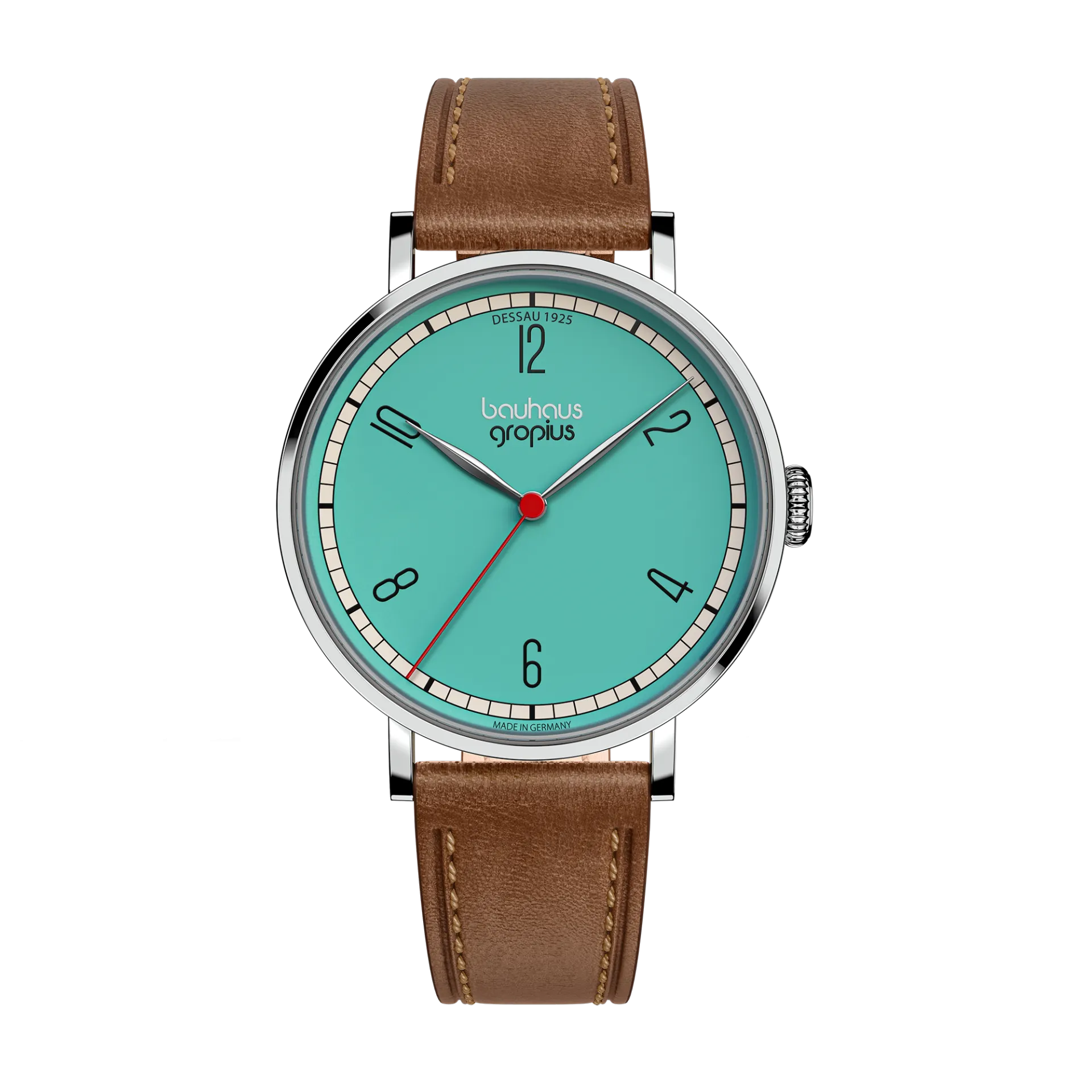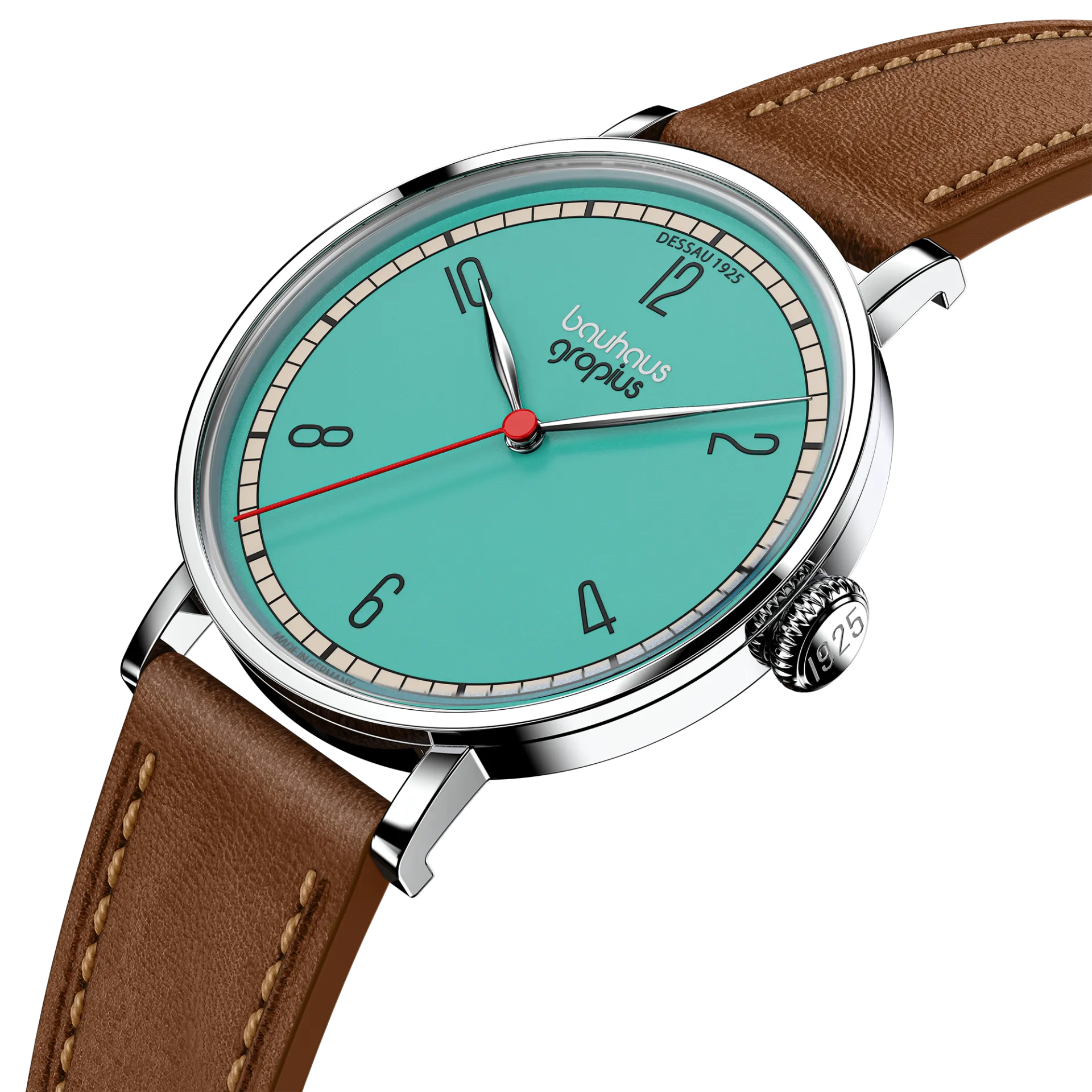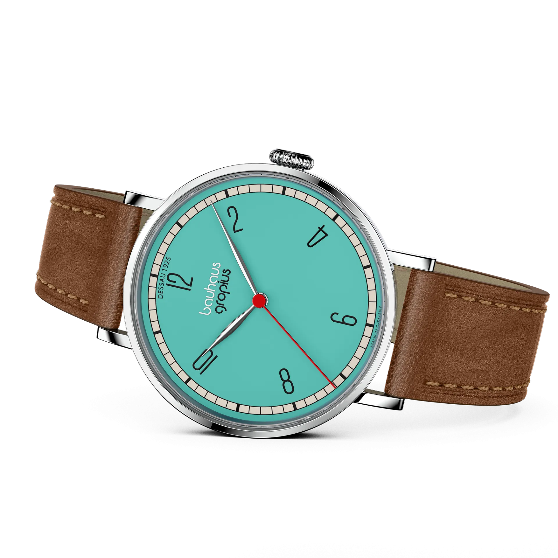 Die Walter Gropius New Bauhaus Dessau 1925 verbindet minimalistisches Design mit klarer Geometrie und moderner Ästhetik. Inspiriert von den prägnanten Farben und Formen Lyonel Feiningers, besticht das Zifferblatt durch klare Linien und reduzierte Details.