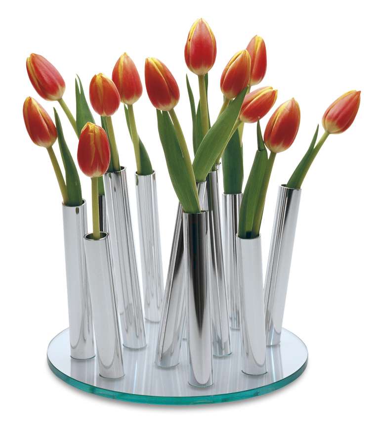 Die BOUQUET Vase von Philippi interpretiert Blumenarrangements auf völlig neue Weise. Einzelne Röhrchen aus poliertem Aluminium erheben sich leicht geneigt aus einer klaren Glasplatte – ganz wie Wildblumen in einer natürlichen Wiese. Jedes Röhrchen bietet einer Blüte ihren eigenen Platz und schafft so ein harmonisches Gesamtkunstwerk.