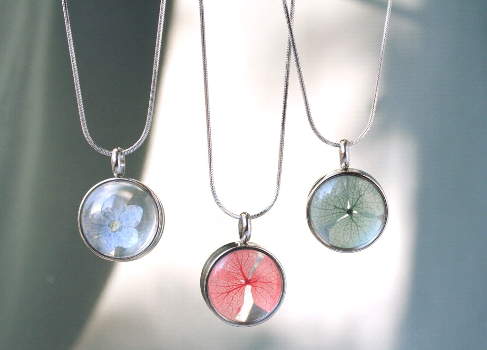 Jedes Medaillon ist handgefertigt und ein Unikat – jede Blüte hat ihre eigene Form, Struktur und Farbnuance. So wird jedes Schmuckstück zu einer ganz persönlichen Erinnerung an die Schönheit der Natur.
