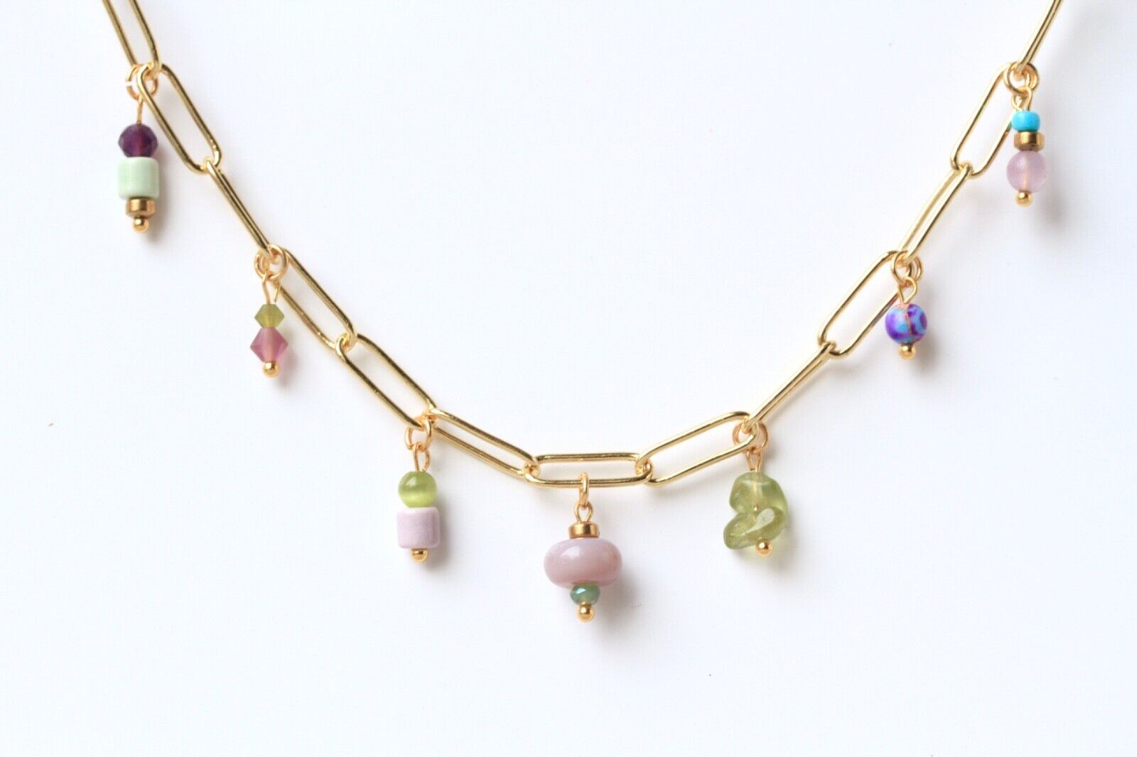 Diese fein gearbeitete Multi-Charm Halskette vereint eine harmonische Komposition aus böhmischen Glasperlen, echten Edelsteinen wie Amethyst, Jade und Peridot sowie vergoldeten Elementen. Durch die zarte Anordnung der Charms entsteht ein luftiger, femininer Stil – ideal für alle, die handgefertigten Schmuck mit Charakter schätzen.