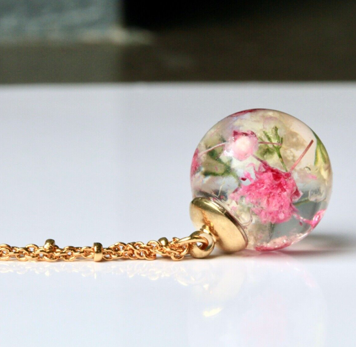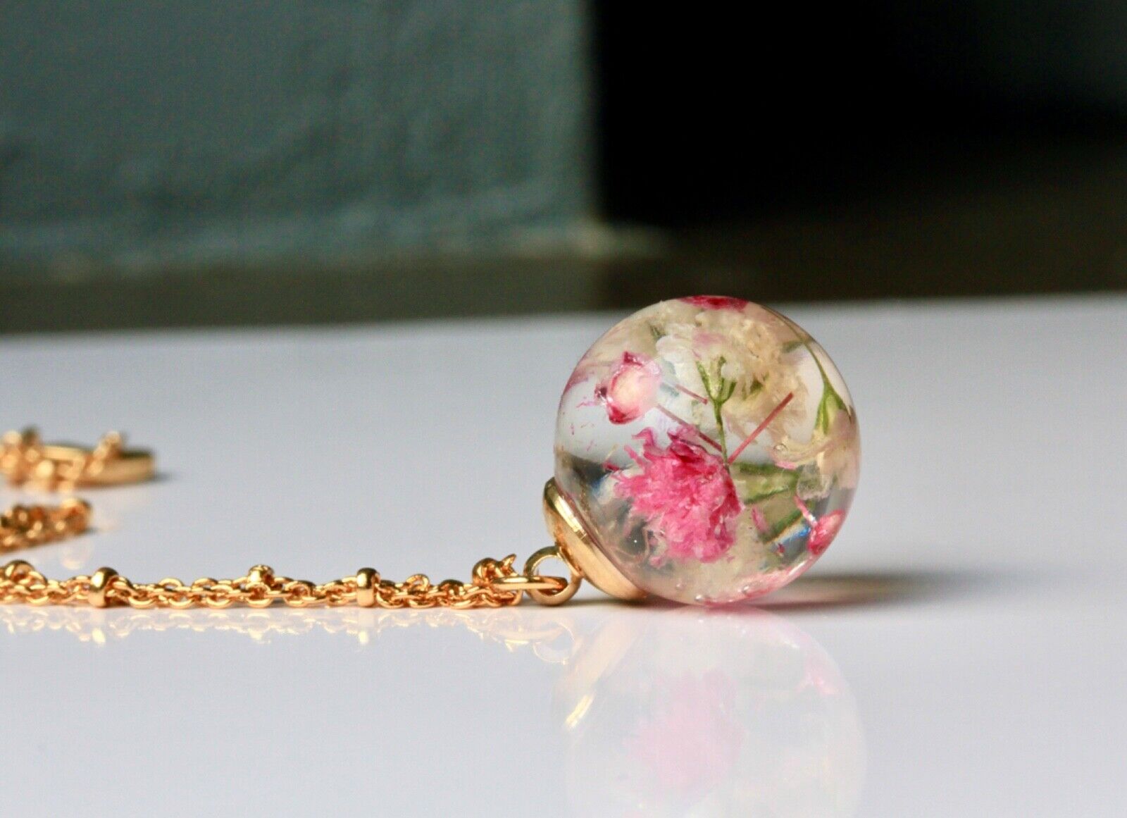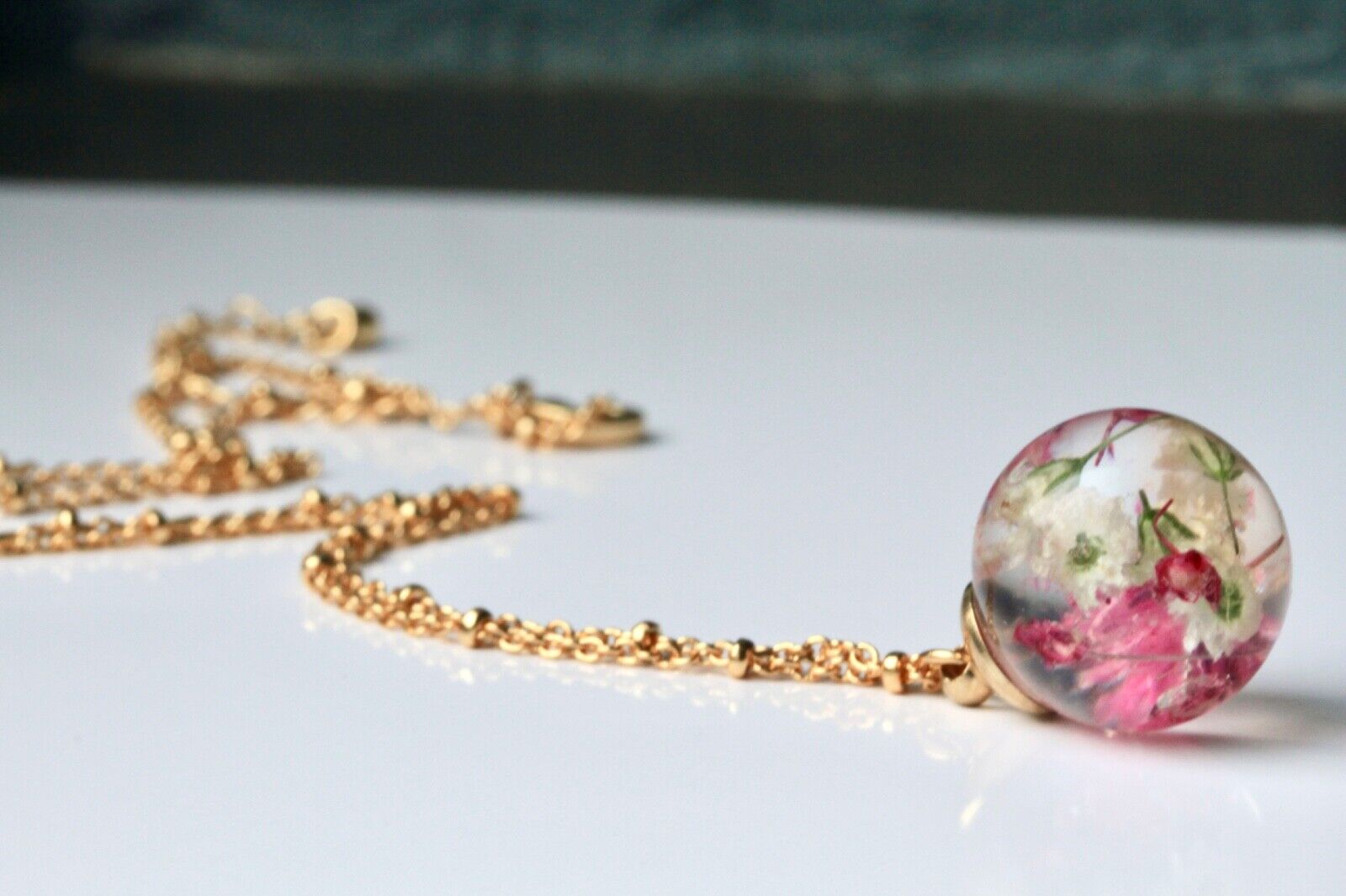 An einer zarten, vergoldeten Kette mit feinen Perlen hängt eine mundgeblasene Glasperle, die sorgfältig mit kleinen, getrockneten Blüten in Weiß und Rosapink gefüllt ist. Jedes Stück ist ein Unikat – romantisch, natürlich und mit Liebe zum Detail gefertigt.