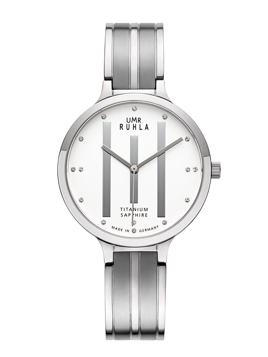 - Titan, satiniert/poliert – mit Titangliederband & weißem Zifferblatt mit silbernen Swarovski Steinchen