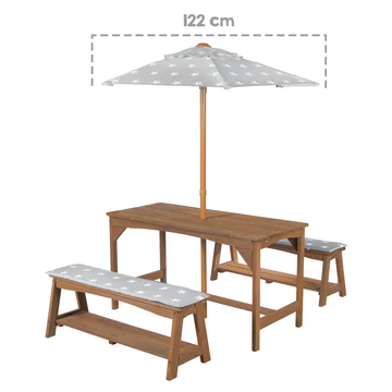Ein großer Sonnenschirm im Design "Little Stars" spendet angenehmen Schatten und sorgt für Komfort an warmen Tagen. Diese pflegeleichte, wetterfeste Sitzgruppe ist langlebig, schadstoffgeprüft und nachhaltig produziert, sodass man sich keine Sorgen um die Gesundheit der Kinder machen muss.