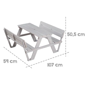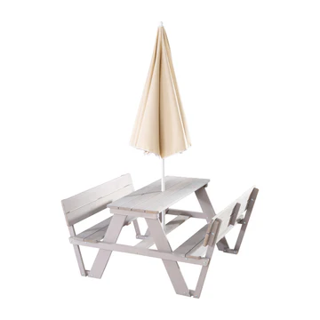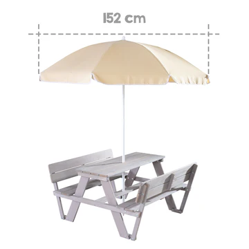 Dieses robuste Set aus Massivholz besteht aus der Sitzgruppe „Picknick for 4“ mit Rückenlehnen und einem passenden Sonnenschirm. Die grau lasierte Garnitur ist wetterfest, langlebig und bietet Platz für bis zu vier Kinder.