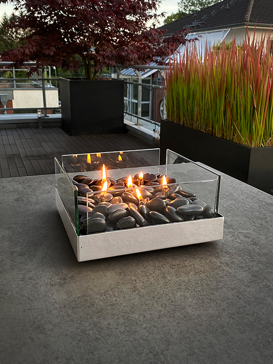 Der moderne Design-Tischkamin überzeugt durch klare Formen und hochwertige Materialien. Gefertigt aus poliertem Edelstahl und Glas, schafft er mit seinen Glasfaserdochten eine angenehme, rauchfreie Flamme. Die Flammen tanzen über schwarzen Flusssteinen und sorgen für eine warme Atmosphäre. Kompakt und vielseitig, passt er sowohl in den Innen- als auch Außenbereich und wird mit praktischem Zubehör zum Befüllen geliefert. Ein stilvolles Highlight für jeden Raum.