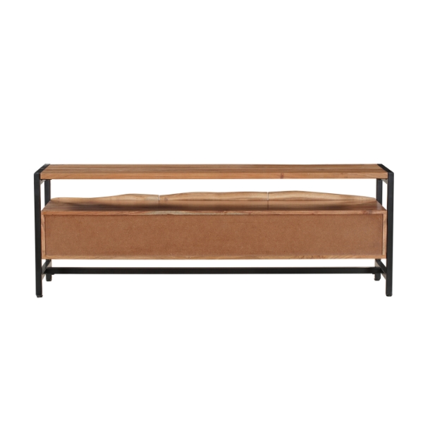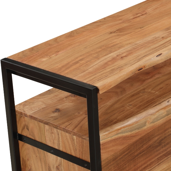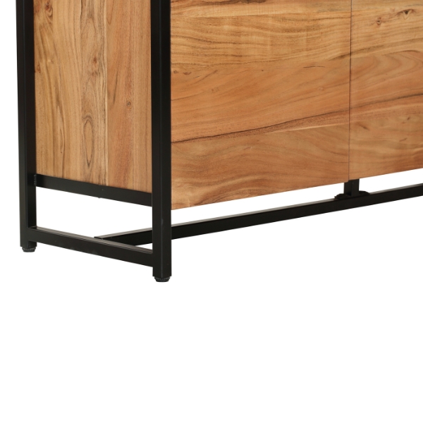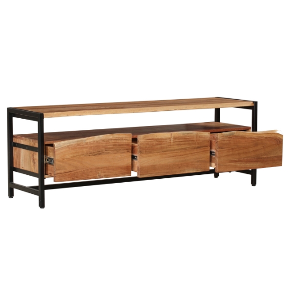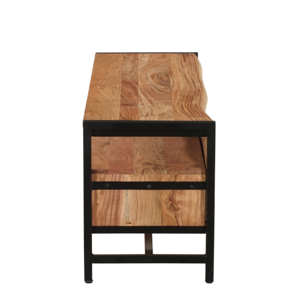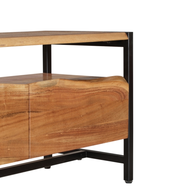 Der TV-Schrank MALA besticht durch eine Kombination aus Akazienholz und schwarzem pulverbeschichtetem Eisen. Mit seinem natürlichen Holzfinish und der robusten Stahlstruktur eignet es sich ideal als funktionales, stilvolles Möbelstück für verschiedene Wohnräume. Die schlichte Eleganz und die hohe Qualität der Materialien machen es zu einem vielseitigen Highlight im Zuhause.